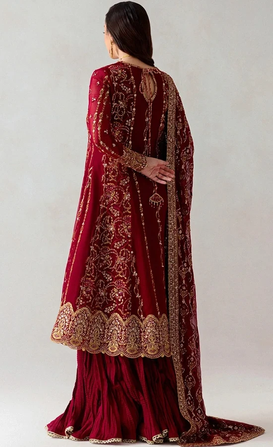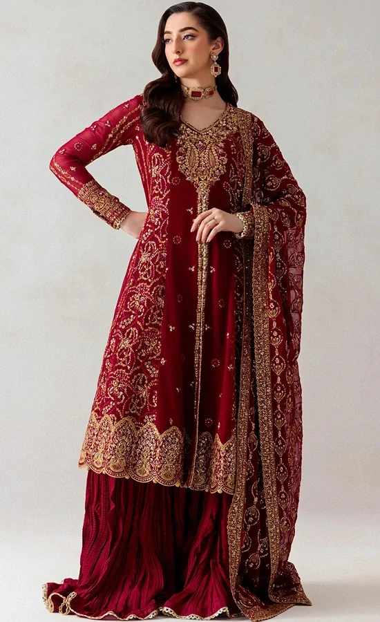 Wedding season is everyone’s favourite season fashion-wise. It’s the best time to get stylish and most gorgeous and experiment with fun new trends as everyone tries to get the luxury look. Be it wedding, party or formal wear, are suckers for dare-to-wear. Check out our current favourite trend to try – the brand-new Maroon Colour Shalwar Kameez. It radiates. Its gold-hand embellishments and super stunning laces will completely elevate your overall look. We bet your wedding day will likely be the most photographed day of your life with our stylish and classy maroon shalwar suit, so it’s natural to want to look your best on the most important day. If you’re a wedding guest and looking to lock who to trust with your fancy outfit, check our this ensemble’s features before buying it;